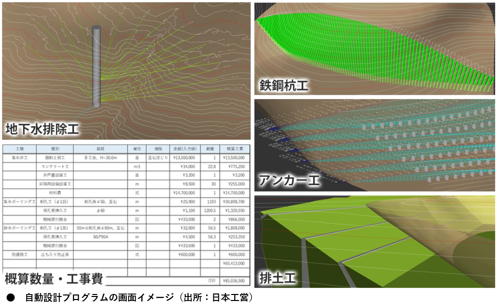 2022年9月に、地すべり・斜面分野の自動設計システム開発を完了し、2022年度中に地すべり対策関連の10業務に活用を開始しました。この自動設計プログラムで、3Dモデリングから概算工事費の算出までを一括で行うことが可能となりました。