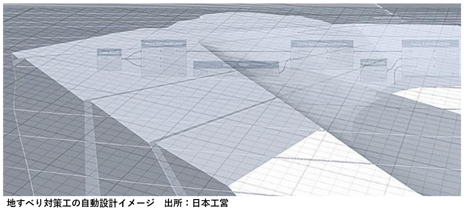 日本工営では、地すべりや土砂災害など斜面防災業務の3次元化をテーマに自動設計開発に取り組んでいます。