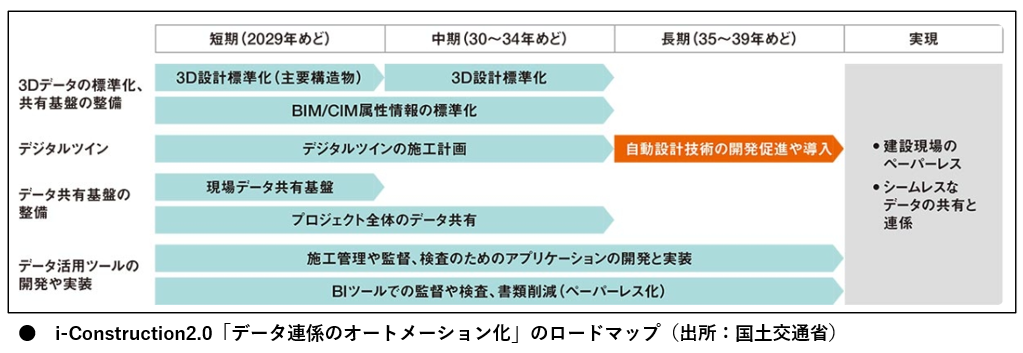 2024年4月に開始した、i-Construction2.0では、2029年を目途に、主要構造物で3D設計を標準化し、以降5年以内に、その他の構造物に3D設計標準化を拡大し、2035年以降は自動設計技術の開発促進や導入を見込む、「データ連係のオートメーション化」のロードマップを明らかにしました。(下図)