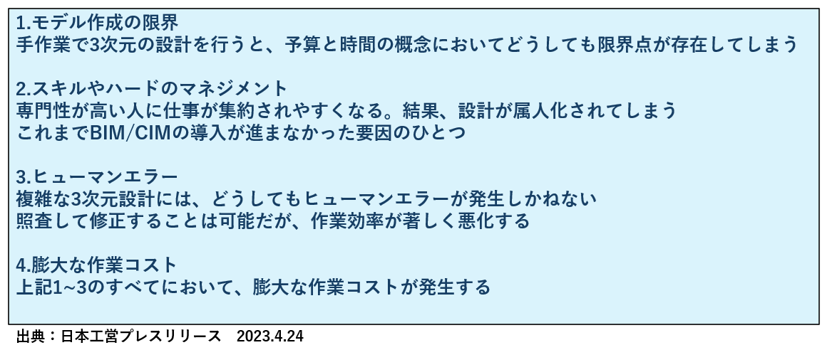 但し、日本工営では、この画期的なBIM/CIMモデル作成には、当初から4つの大きな課題が立ちはだかっているとしていました。(下表)