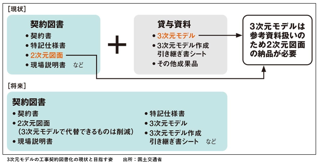 下図は国土交通省による「3次元モデルの工事契約図書化」の流れです。