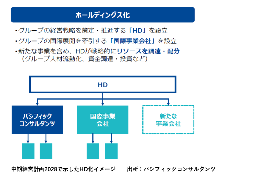 HD傘下にパシフィックコンサルタンツを置くかたちで始動し、HDがグループ企業を含めた全体の経営戦略を策定・推進していきます。
