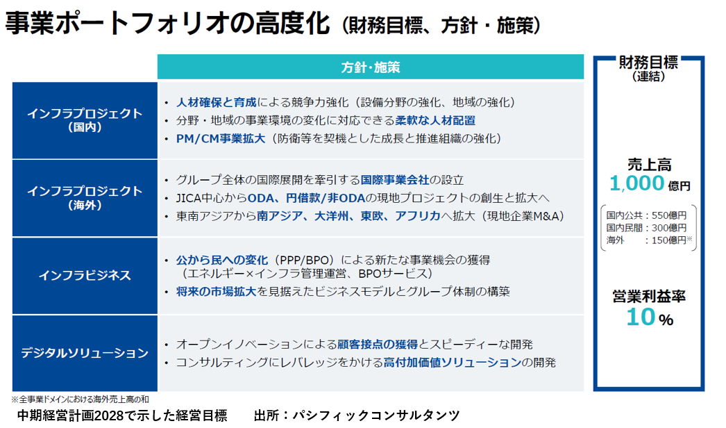パシフィックコンサルタンツHDは、当面の経営目標として、2028年9月期の連結業績で売上高1000億円、営業利益率10%の達成を掲げており、売上高の内訳は、国内公共分野550億円、国内民間分野300億円、海外事業分野150億円としています。グループ企業再編については、パシフィックコンサルタンツが担ってきた既存領域の一部を段階的にグループ会社に移行していき、新たな市場や顧客の開拓と価値創造に向けてグループとして展開をしていく計画です。