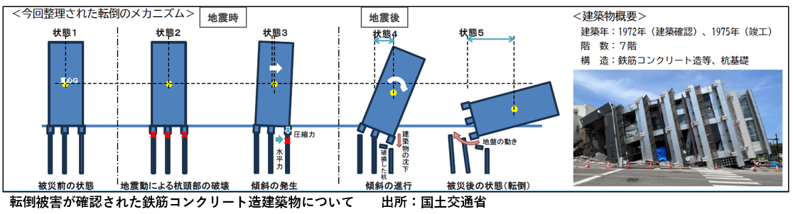 基礎杭の破壊後に建物下面を支える表層地盤が軟弱であったため、建築物の沈下に伴い傾斜が更に進行し転倒状態に至ったとされ、転倒に至るメカニズムについて未解明の部分も多くあるものの、分析された状態が複合的に関連した結果、転倒被害が生じたものと、現時点で整理されました。