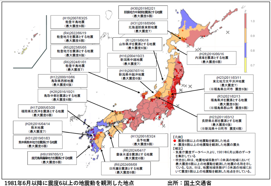 下図は、新耐震基準が適用開始となった、「1981年6月以降に震度6弱以上の地震動を観測した地点」を地図表示したものです。