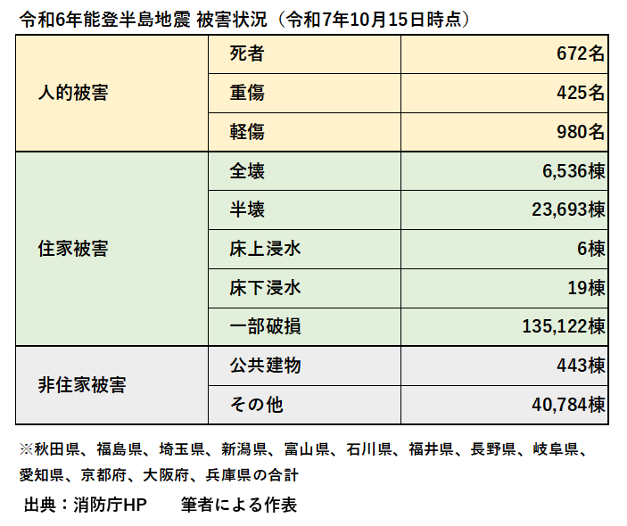 同地震は数多くの建築物に倒壊などの被害をもたらしました。その人的被害や住家に対する被害状況を、令和7年10月15日時点でまとめたものが下表となります。