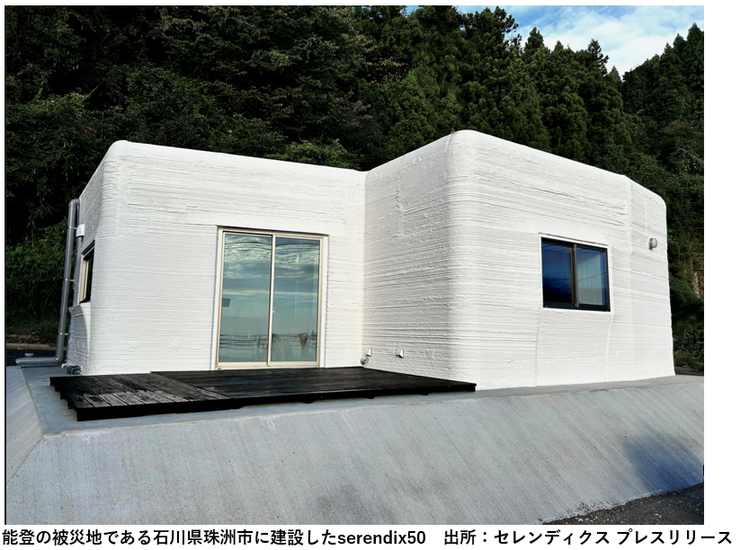 セレンディクスは、日本初の3Dプリンター住宅メーカーとして、2022年3月に日本初の3Dプリンター住宅「serendix10」を完成させたのを皮切りに、2024年9月には2人世帯向け住宅「serendix50」の販売第1号棟を復興住宅モデルとして石川県珠洲市に建築しました。またJR西日本グループと資本業務提携し、JR初島駅駅舎など住宅以外のプロジェクトも手がけています。