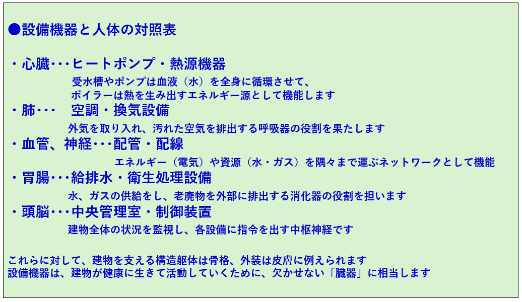 建築物における各種設備機器は、心臓、肺、血管、神経系等に例えられる生命線であり、その設置工事および関連工事全般のマネジメントを担うことが設備施工管理の根幹となります。(下表参照)
