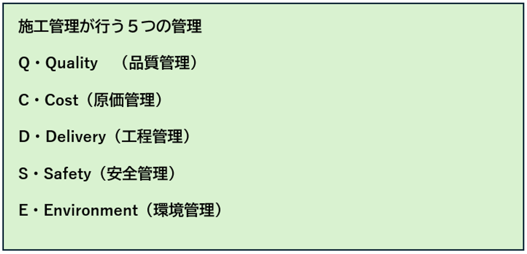施工管理は共通して「Q・C・D・S・E」の管理を行ないます。