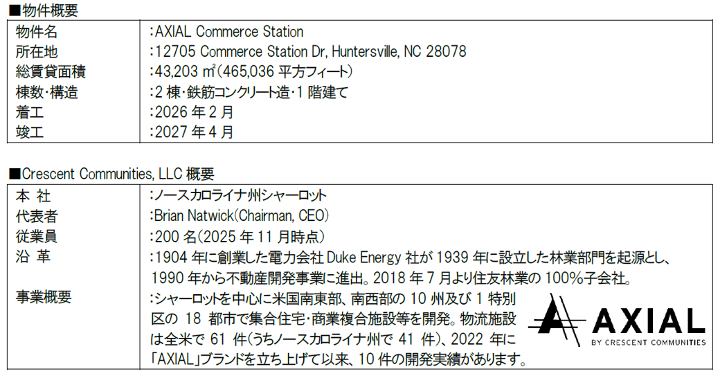 2026年1月14日、住友林業100%子会社Crescent Communities, LLC(米ノースカロライナ州シャーロット、以下クレセント社)と中央日本土地建物株式会社は、米ノースカロライナ州シャーロット市近郊でマルチテナント型の物流施設を開発し、2026年2月着工、2027年4月竣工を目指していることを発表しました。