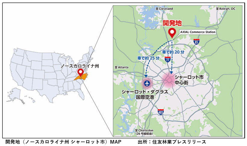 出典:ノースカロライナ州シャーロット市近郊で物流施設を共同開発 ~輸送効率に優れた物流拠点を実現~(住友林業プレスリリース)
