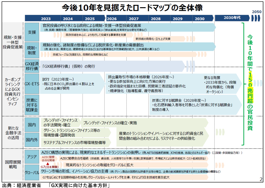 2022年に制定された「GX実現に向けた基本方針」では、「水素・アンモニア」、「蓄電池産業」、「鉄鋼業」、「化学産業」、「セメント産業」、「紙パ産業(製紙業)」、「自動車産業」、「資源循環産業」、「住宅・建築物」について、年次を追ったGX実現に向けた「今後の道行き」として、取り組んでいく施策が検討されました。