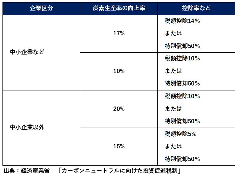 中小企業は税額控除率が高く設定されており、企業規模に関わらず炭素生産性の向上に前向きとなれる制度といえるでしょう。