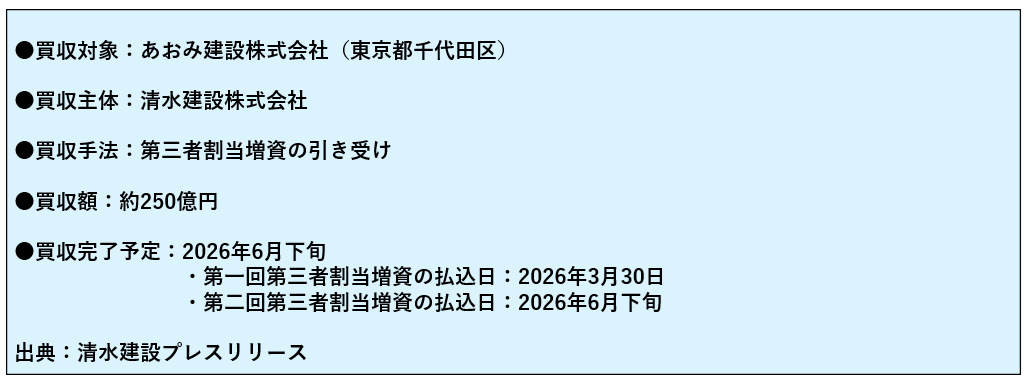 出典:あおみ建設株式会社の第三者割当増資引受による連結子会社化に関するお知らせ(清水建設プレスリリース)