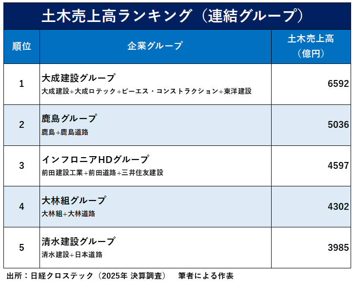 近年、大手建設業では土木売上が好調で増進が続いています。大型M&Aによる経営統合の動きも活発化しており、2025年は大成建設による海洋土木大手の東洋建設買収や、三井住友建設を完全子会社化したインフロニア・ホールディングスの経営統合がありました。