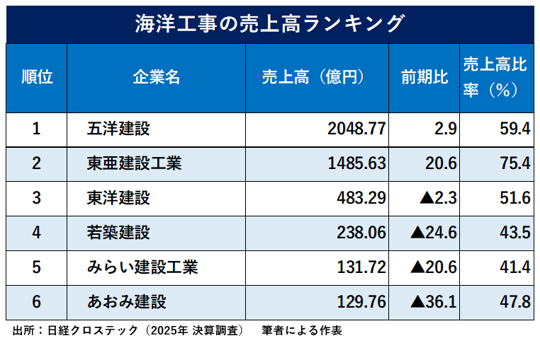 強みとする海洋工事では、「横浜港におけるコンテナ埠頭の岸壁改良工事」や「和歌山下津港における防波堤築造工事」、「伊勢湾海上における中部国際空港の建設工事」などを手掛けた実績があり、2025年3月期の海洋工事売上高は129億円で業界6位でした。