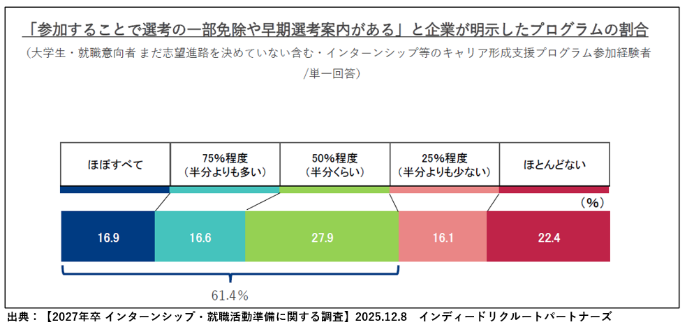 インターンシップ等キャリア形成支援プログラムに参加した学生に、「参加することで選考の一部免除や早期選考案内がある」と企業が事前に明示したプログラムの割合は、「50%程度(半分くらい)」が最も高く27.9%で、「ほぼすべて」「75%程度(半分よりも多い)」を含めると6割を超えています。