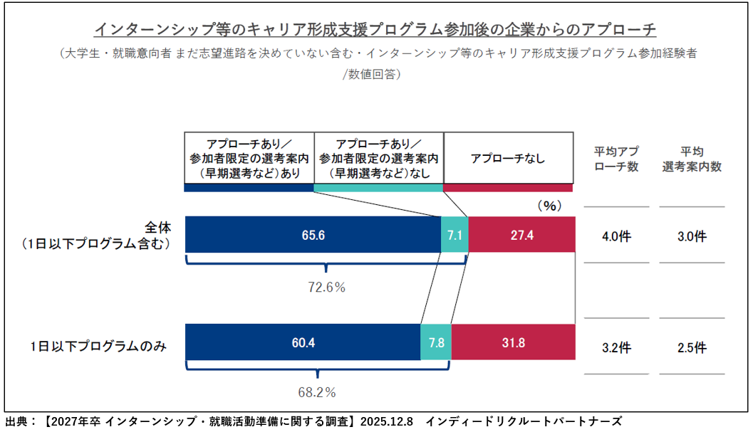 2027年卒に対して、インターンシップ参加企業からどのようなアプローチがあったのかを、インディードリクルートパートナーズ・リサーチセンターが調査し、その結果を2025年12月8日付レポートで報告しています。