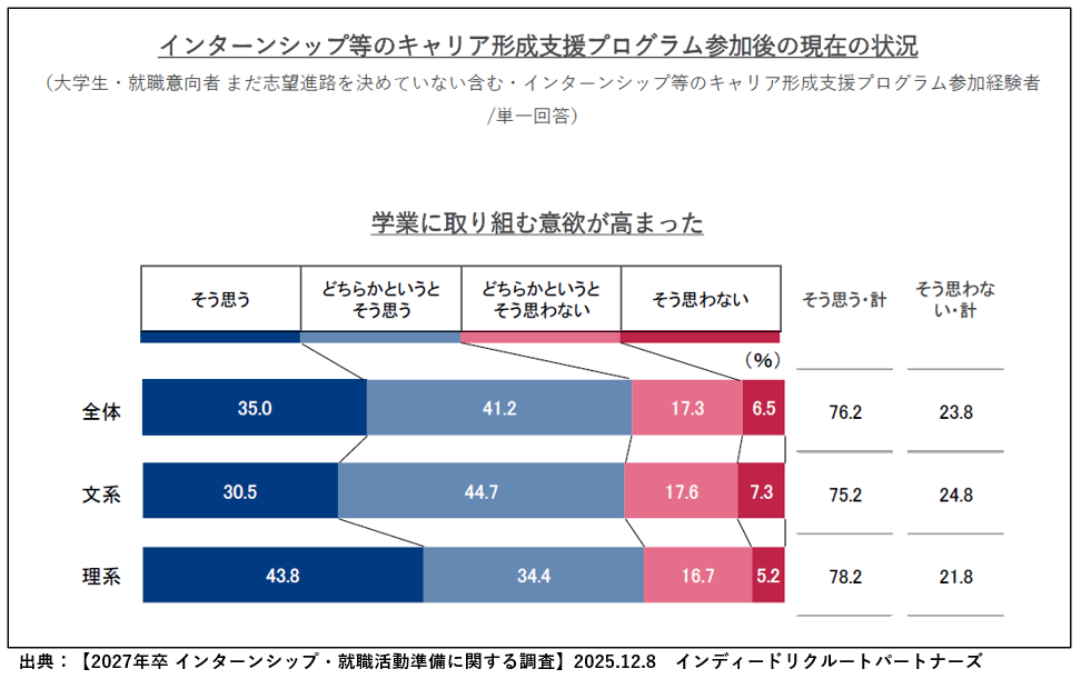 志望業界が人によって異なる文系大学に比べると、学部学科の専攻領域から、自ずと志望業界・企業が決まりやすい理系大学では、オープン・カンパニーやインターンシップ等のキャリ形成プログラムへ参加することは、「学業に取り組む意欲」を増進させる結果が得られやすいものです。