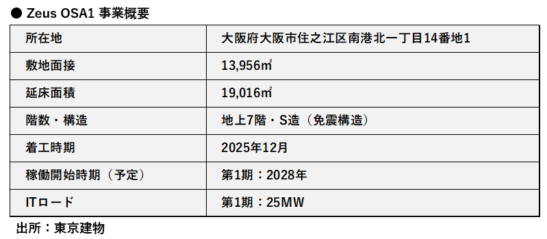 出典:大阪南港エリアのハイパースケールデータセンター「Zeus OSA1」2025年12月着工、2028年第1期稼働開始(東京建物プレスリリース)