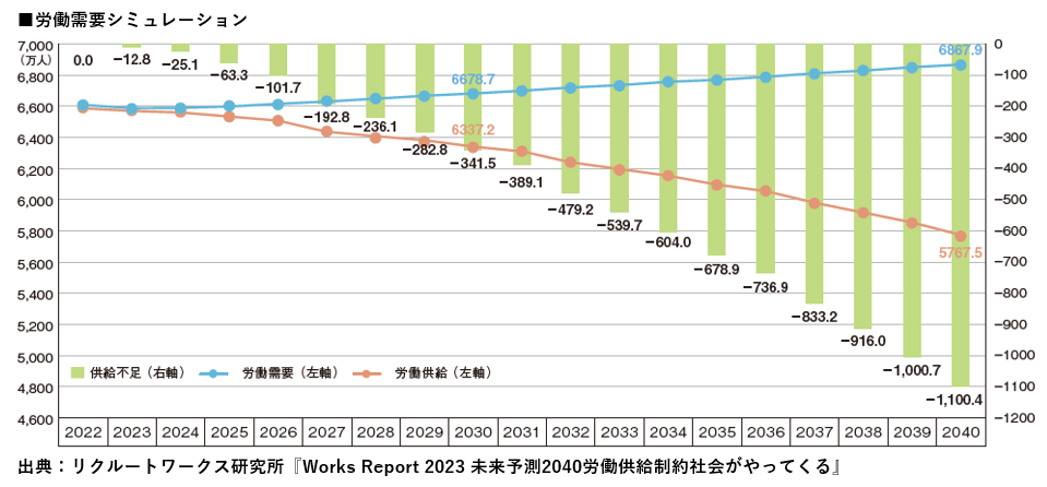 例えば、労働人口は需要予測に対して、2030年に約341 万人、2040年には約1,100万人が不足する見込みといわれているのです。(下グラフ)
