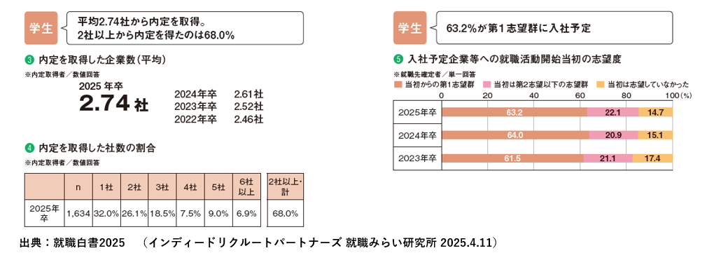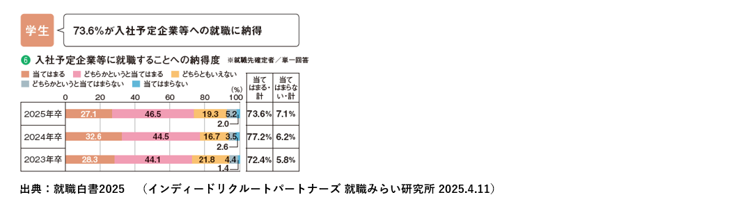 これらのことから、2025年卒の学生は比較的早い時期に本命企業群から内定を得ており、就職先に対する納得度も高い傾向があることに間違いありません。