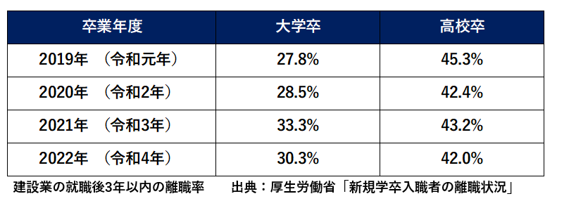 厚生労働省のデータを基にした、近年の建設業における3年以内離職率の推移を表として作成しました。(下表)
