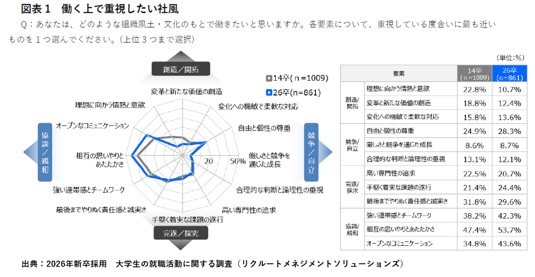 「働く上で重視したい社風として「理想に向かう情熱と意欲」、「厳しさと競争を通じた成長」といったハードな組織は好まれず、「相互の思いやりとあたたかさ」、「オープンなコミュニケーション」、「強い連帯感とチームワーク」のある「協調/親和」的な組織が支持されている。」