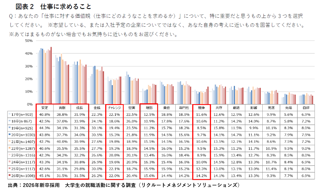 「仕事に求めることの1位は「安定」、次いで「貢献」、「成長」がほぼ同水準で並ぶ結果」となり、「安定」は過去10年で最も高い選択肢に。