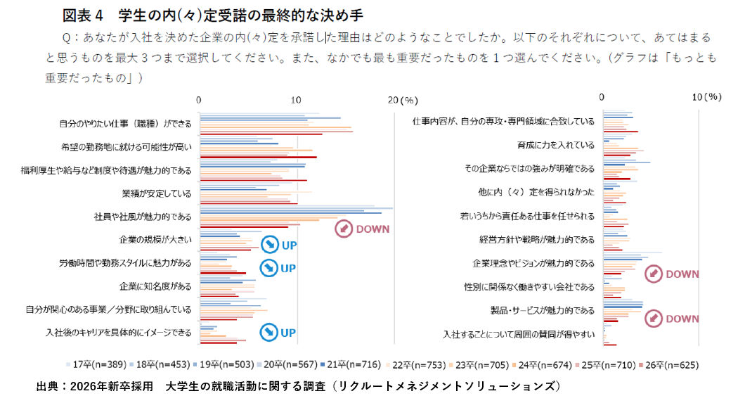 「内(々)定受諾の最終的な決め手は「自分のやりたい仕事 (職種 )ができる」が 1位。「勤務地」「福利厚生」「業績の安定性」など働く環境・条件に関する項目の選択率が伸びた結果、昨年まで2位の「社員や社風が魅力的」は 5位となった。」