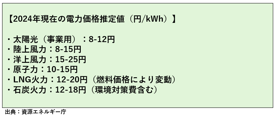 火力発電は比較して高く、国際情勢の変化によって、化石燃料の価格が上昇すれば直接的な影響を受けて電力価格の上昇につながります。