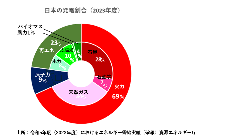 資源エネルギー庁が2025年4月に発表したデータによると、2023年度、日本の電力の約69%は火力発電によるものです。内訳は天然ガス(LNG)が約33%、石炭28%、石油等7.4%で、化石燃料が電力供給の約7割を占めています。