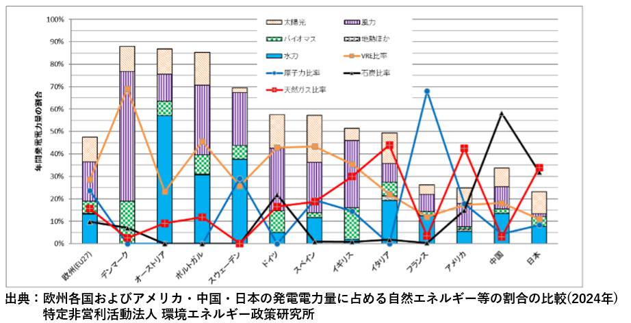 欧州では再生可能エネルギーの割合が40%を超える国も多く、イギリスは風力発電を中心に進めて2024年9月に石炭火力を廃止しました。中国は石炭火力が約65%ですが、再生可能エネルギー比率は2014年の3.2%から2024年には18.1%へ急増し、発電量も10倍になっています。アメリカは火力が約60%で再生可能エネルギーと原子力がそれぞれ20%程度となっています。