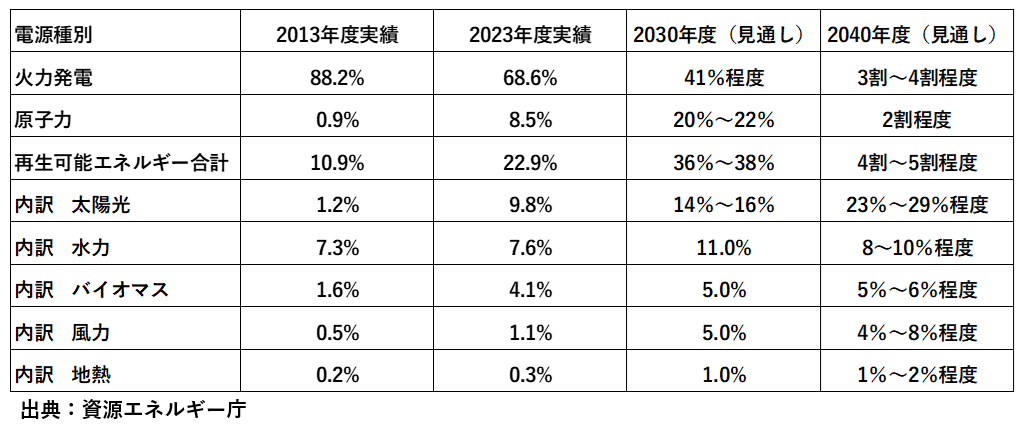 2013年と2023年の電源構成実績、及びエネルギー基本計画で示された2030年度と2040年度の電源構成見込みについて、下表に整理してみました。