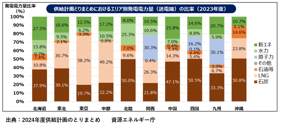 日本全体のデータを地域別に見ると、電源構成は地域によって大きく異なります。