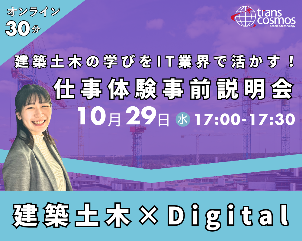 インターン/オープン・カンパニー 27年卒 大学院 大学 高専 短大 専門 職能大 短時間 服装自由 2025年10月29日(水)17:00 「建設×Digital?」建築土木の学びをIT業界で活かす!秋の仕事体験・インターンシップ事前説明会 締切日時: 2025年10月27日(月)08:00 開催場所: オンライン 主催企業: トランスコスモス株式会社 詳細を見る