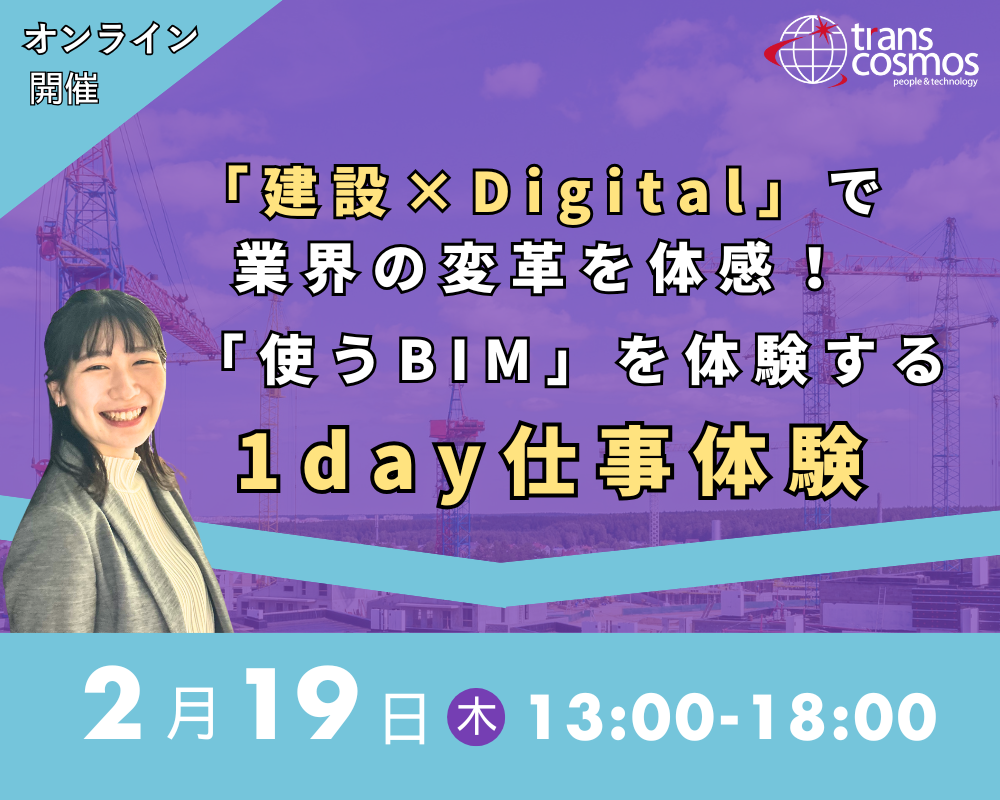 27年卒 大学院 大学 高専 短大 専門 職能大 業界研究/実務が学べる 服装自由 2026年02月19日(木)13:00 「建設×Digital」で業界の変革を体感!「使うBIM」を体験する1day仕事体験 締切日時: 2026年02月06日(金)08:00 開催場所: オンライン 主催企業: トランスコスモス株式会社 詳細を見る